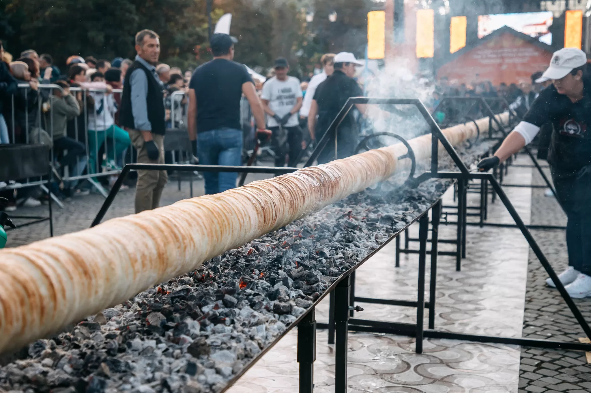 Piața Centrală din Sfântu Gheorghe a găzduit în acest weekend o nouă ediție a Festivalului Kürtőskalács, transformând orașul într-o veritabilă capitală a dulciurilor secuiești și a tradițiilor maghiare. Un colac secuiesc record, de 21 de metri lungime, a fost vedeta festivalului, preparat de echipa Borbély Kurtoskalacs din Armășeni, cu sprijinul Asociației Szekely Gazdaszervezetek. Performanța depășește cu jumătate de metru recordul stabilit în ediția precedentă și înscrie orașul în Cartea Recordurilor Maghiare.